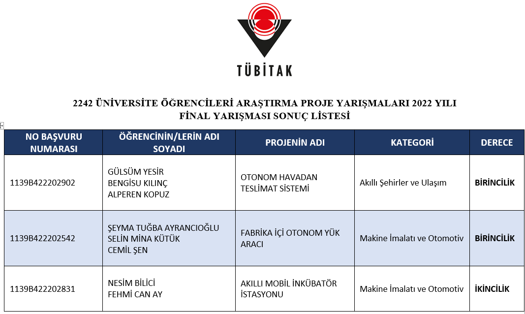 2022 yılında 2242 Üniversite Öğrencileri Araştırma Proje Yarışmalarında dereceye giren şimdi mezun olmuş öğrencilerimizi tebrik ederiz.