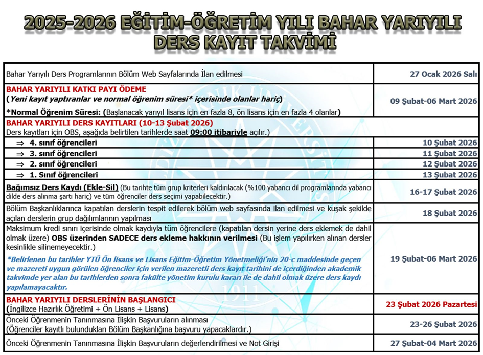 https://ogi.yildiz.edu.tr/ogi/10/Y%C3%B6netmelikler-ve-Y%C3%B6nergeler/36 - Ders seçimleri, her sınıf için ilgili günde saat 09.00’da açılacaktır.
