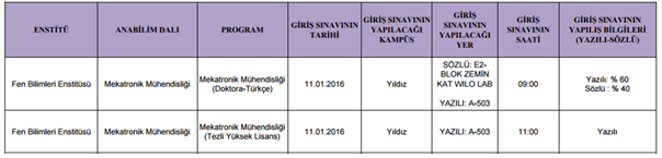 YTÜ Mekatronik Mühendisliği Bahar Yarıyılı Lisansüstü Giriş Sınavlarının Gün, Yer, Saat ve Yapılış Bilgileri: