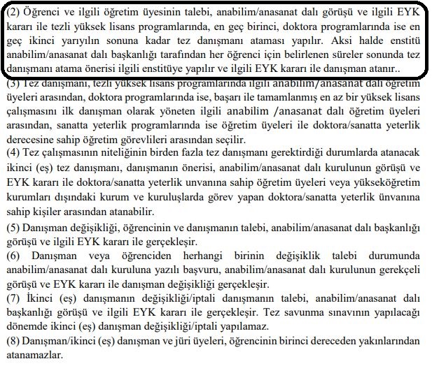 28 Haziran 2018 Tarihli Yıldız Teknik Üniversitesi Lisansüstü Senato Esasları Madde 27-2'ye göre öğrenci ve ilgili öğretim üyesinin talebi, anabilim/anasanat dalı görüşü ve ilgili EYK kararı ile tezli yüksek lisans programlarında, en geç birinci, doktora programlarında ise en geç ikinci yarıyılın sonuna kadar tez danışmanı atamasının yapılması gerekmektedir.