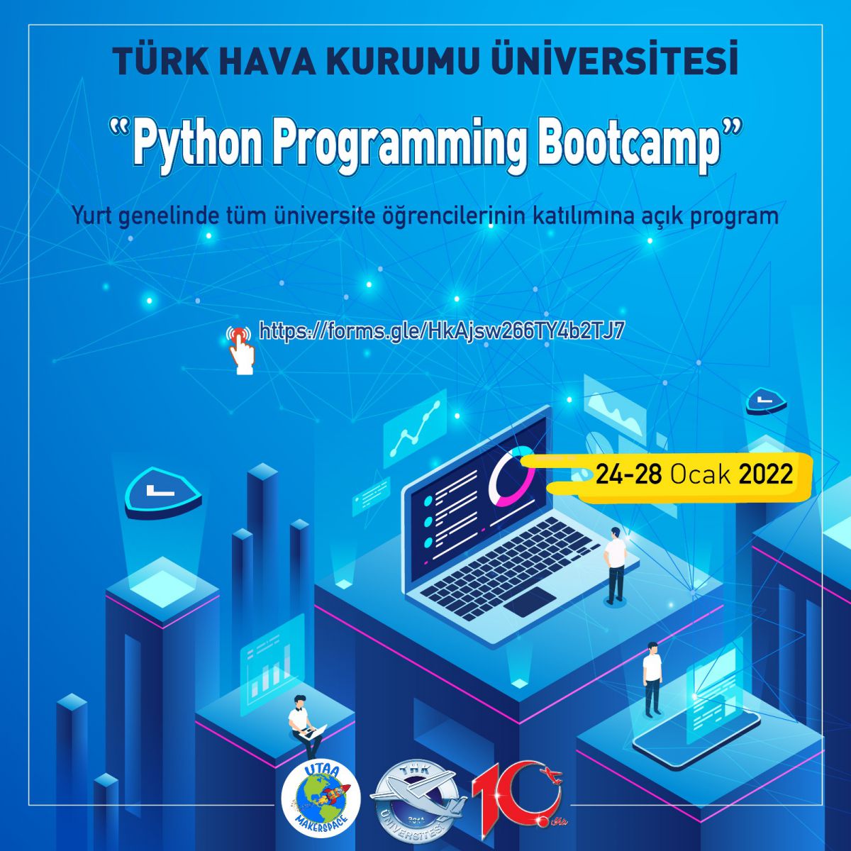 Türk Hava Kurumu Üniversitesi Araştırma Merkezi bünyesinde Sosyal Sorumluluk Projesi olarak, 24-28 Ocak 2022 tarihlerinde çevrimiçi “Python Programming Bootcamp" eğitimi düzenlenecektir.