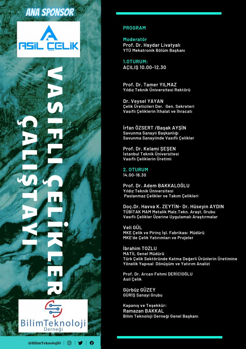Vasıflı çeliklerin yerli ve milli imkanlar dahilinde üretilmesi konusunda kamu, üniversite, çelik üreticileri, savunma sanayicileri ve sivil toplum örgütlerince düzenlenen Vasıflı Çelik Çalıştayı, 26 Mart 2022 saat 09:15'te bölüm başkanımız Prof. Dr. Haydar Livatyalı moderatörlüğünde Yıldız Kampüsü Oditoryum'da gerçekleştirilecektir. Çalıştayla ilgili detaylar için ekte yer almaktadır.