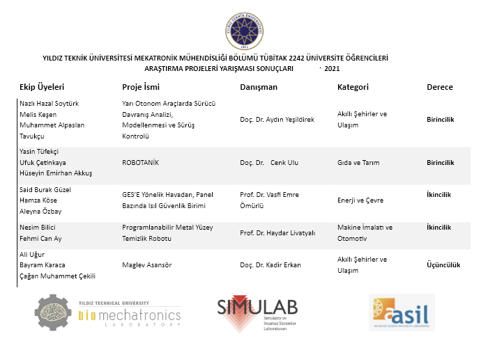 TÜBİTAK 2242 Üniversite Öğrencileri Araştırma Proje Yarışmaları sonuçlarında bölümümüz mevcut ödüllerin % 14'ünü alarak önemli bir başarıya imza attı. Öğrencilerimizi ve danışman hocalarımızı tebrik ederiz.